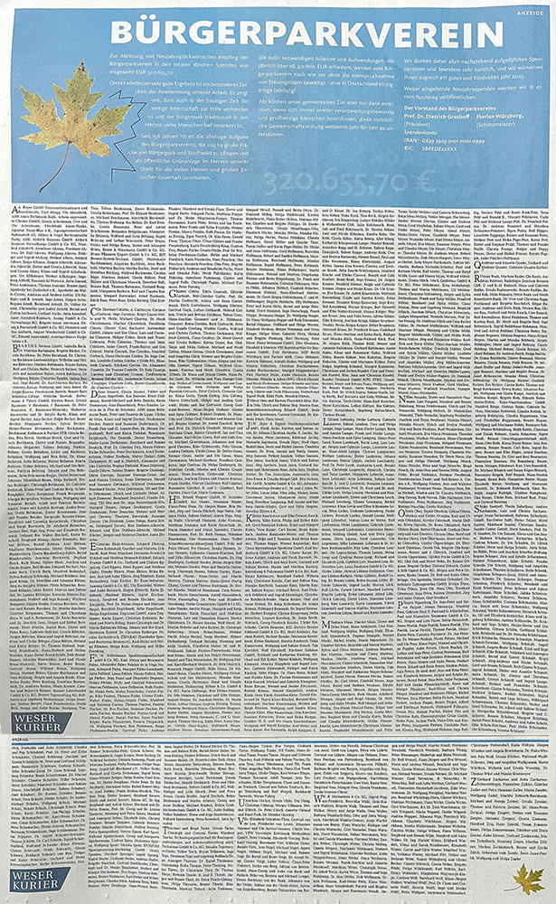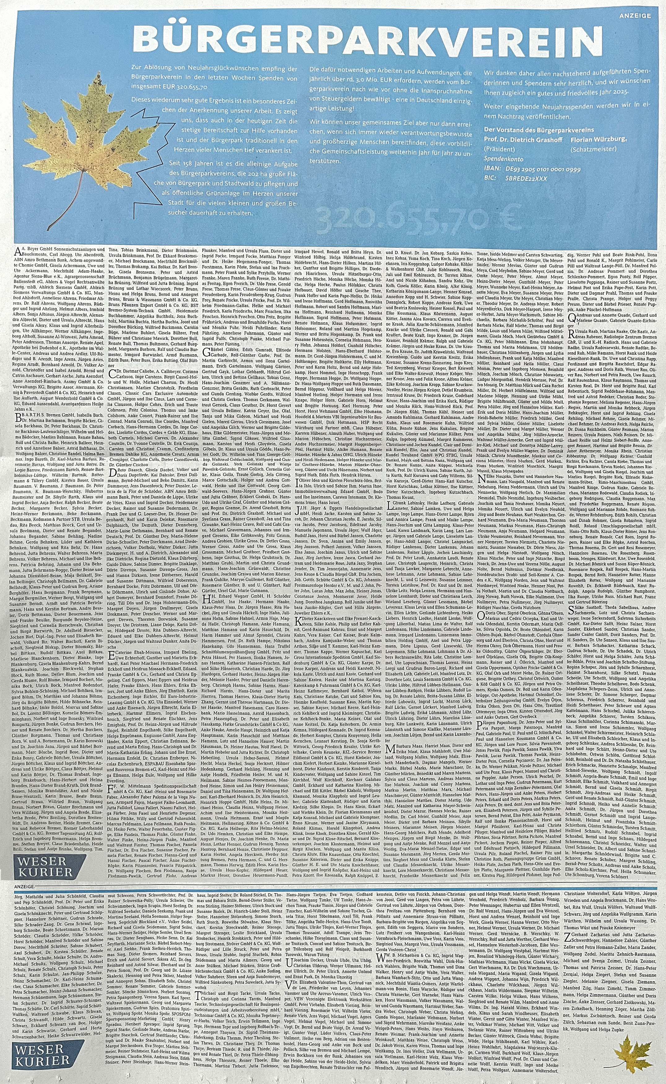 Der Bürgerparkverein dankt allen unten genannten Spenderinnen und Spendern ganz herzlich und wünscht Ihnen zugleich ein gutes und friedvolles 2025.